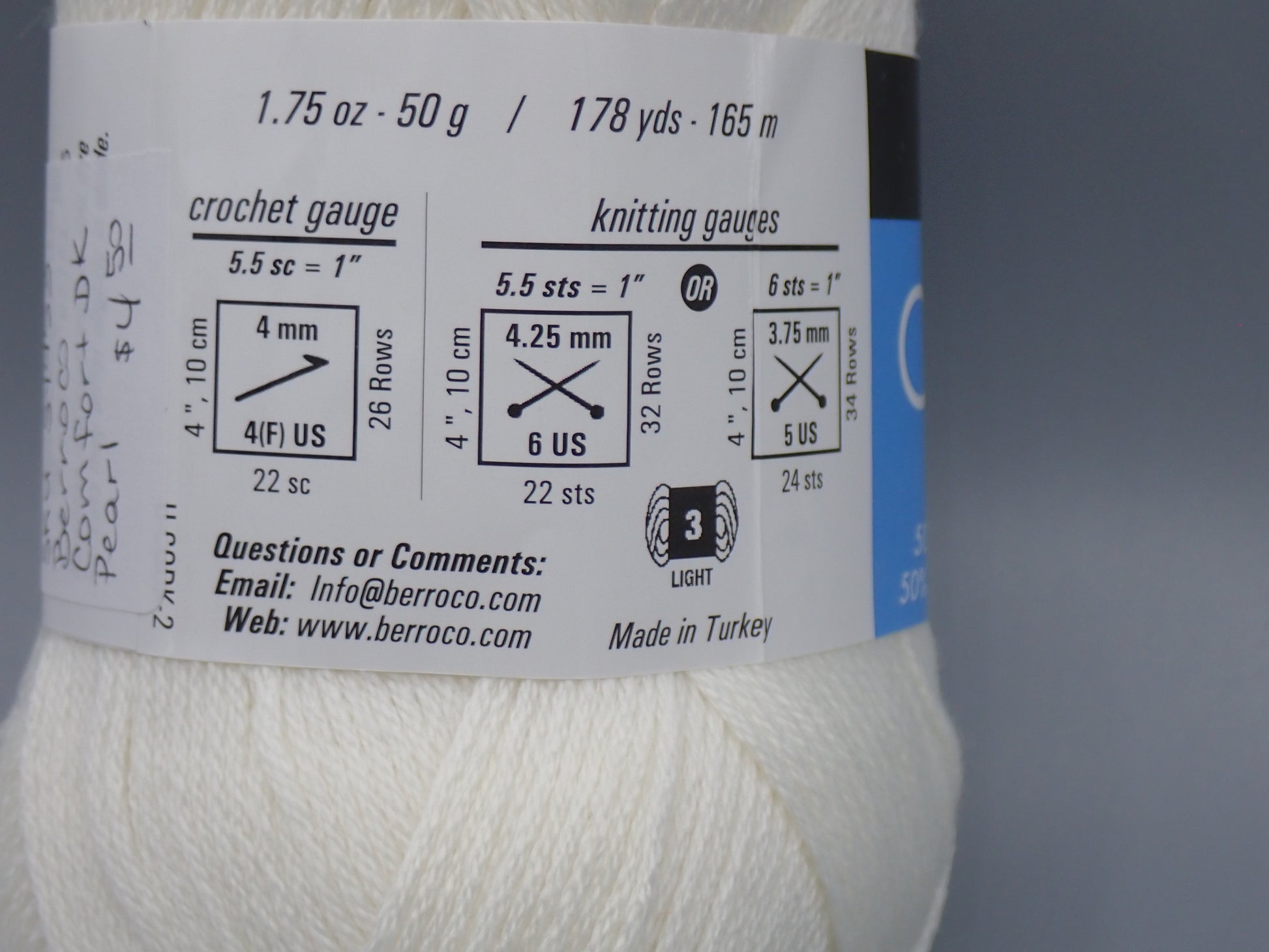 Berroco Comfort DK is a blend of economy, quality and performance in a superfine blend of acrylic and nylon. This yarn can be perfect for children's items, or anything where you want super squishiness.
