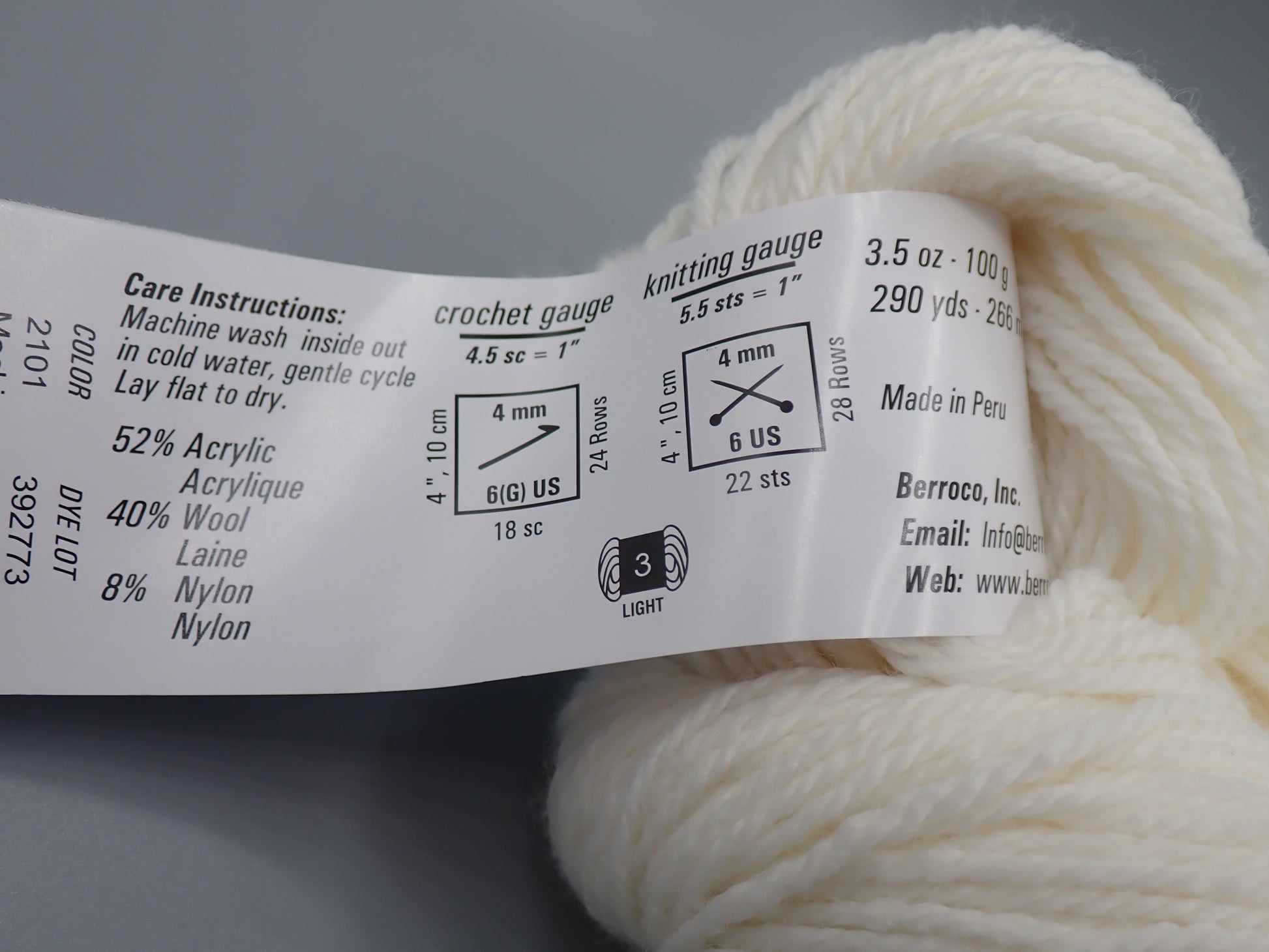 - Fiber: 52% Acrylic, 40% Wool, 8% Nylon