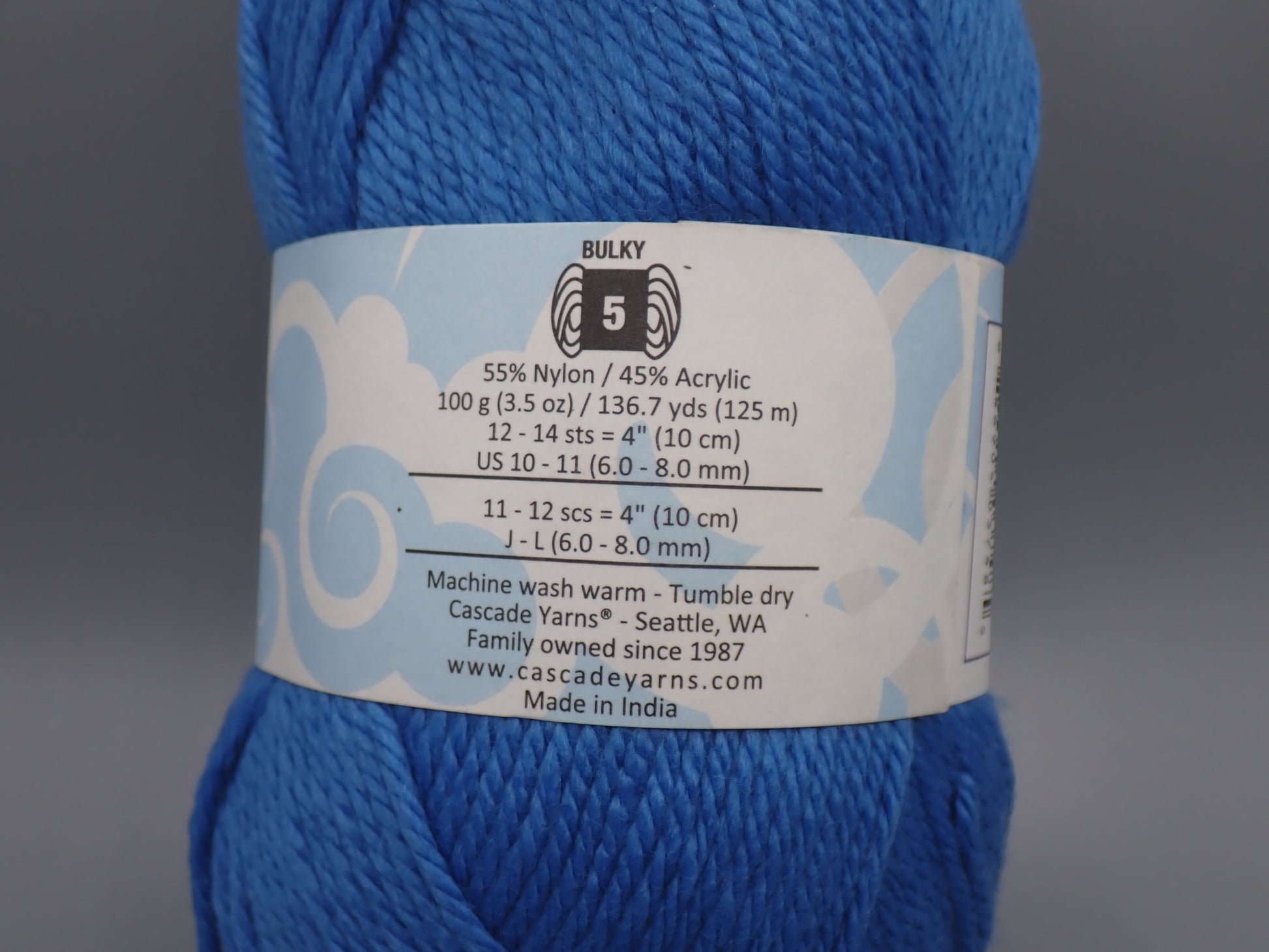 The chunky yarn is an easy care blend of acrylic and nylon which makes it soft and durable. This yarn is perfect for children’s apparel, blankets, and other hard wearing hand-knit or crochet items.