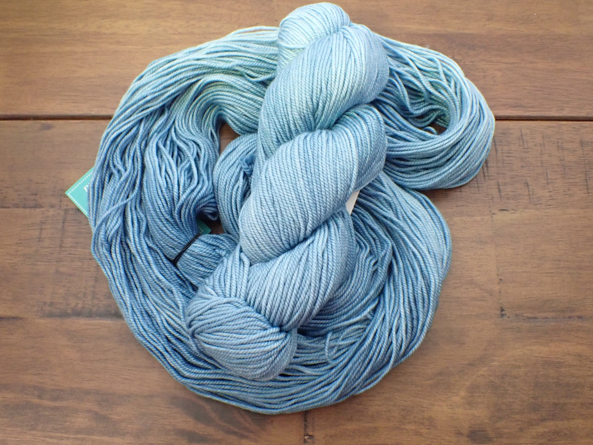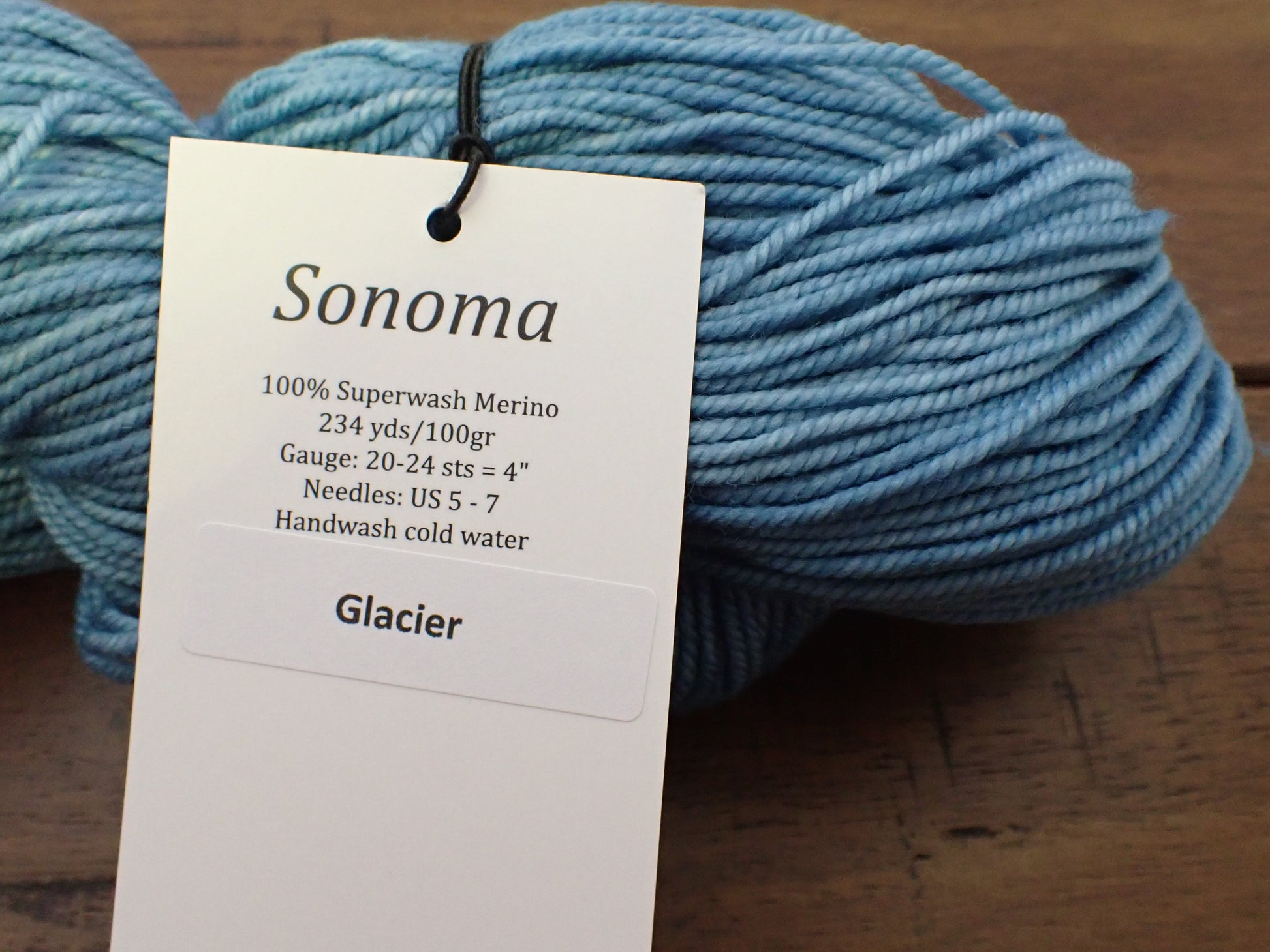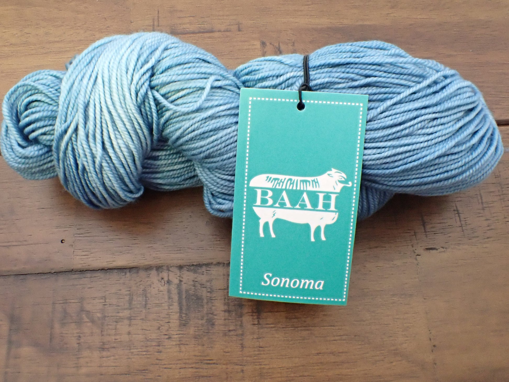 Baah Sonoma in Glacier. A solid skein of blue. Perfect for your next cardigan. DK Weight. 100% Superwash Merino yarn. 234 yards. Hand wash cold water. $25.00 per skein.