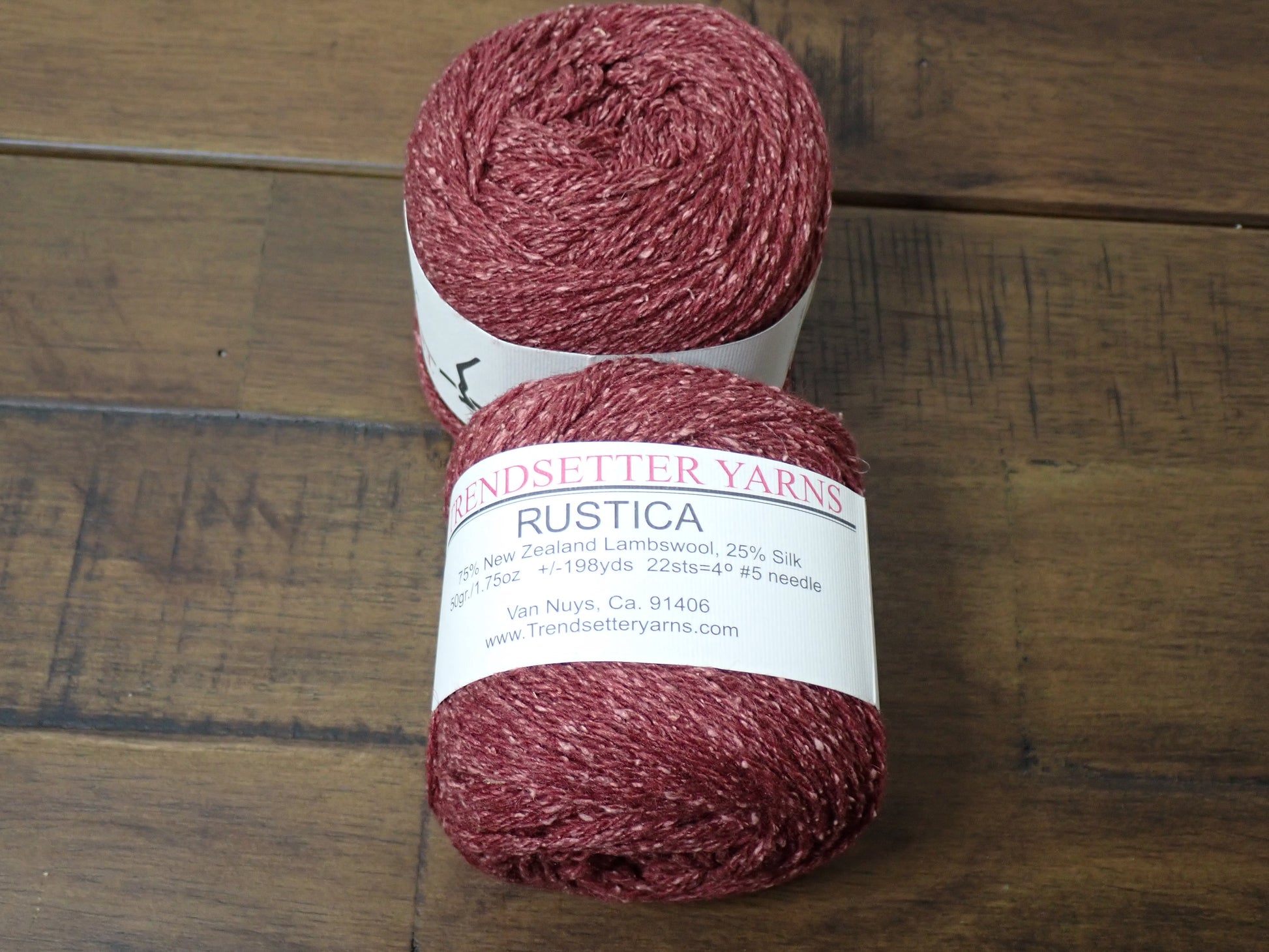 A deliciously gorgeous blend of wool and silk. The two fibers are intimately blended before dying so that the silk takes on a shade of each color. Easy to knit and wear. 75% New Zealand Wool, 25% Silk. 195 yards. A nice dark red color to go with anything.