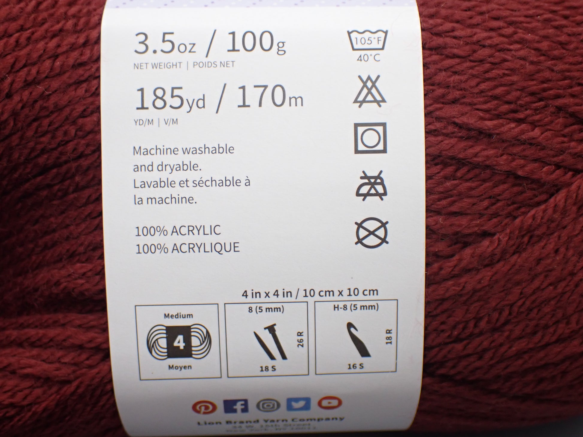 Worsted weight, 185 yards, 100% acrylic, machine wash and dry.