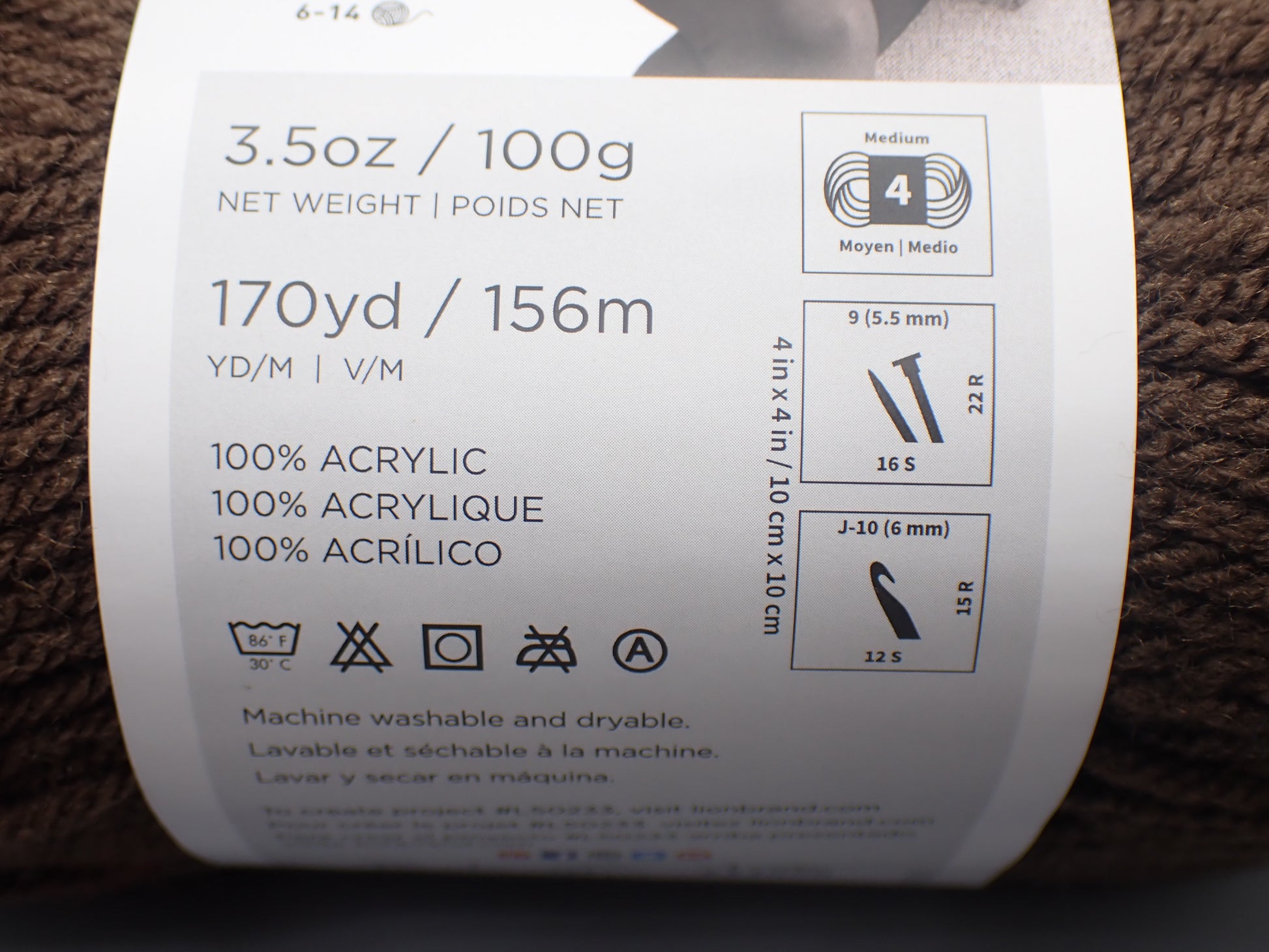 Worsted weight, 170 yards, 100% Acrylic, machine wash and dry.
